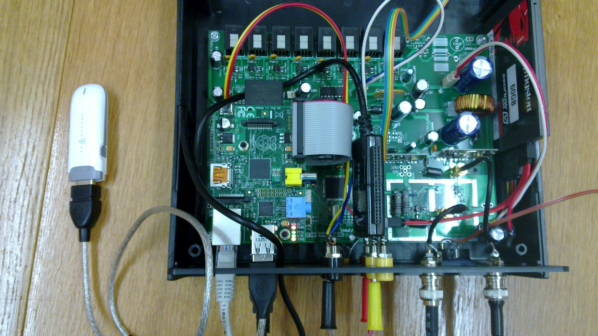 Assembled device in an open enclosure - with Raspberry Pi board and SSD disc, USB/SATA adapter